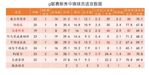 而且在三分出手数较高的背景下,瀚森最终的真实命中率高达67.8%,与其他球员比并无明显劣势。综合来看瀚森本赛季在G联赛打出的进攻水平,在一二年级中锋球员里至少能排进前3名。