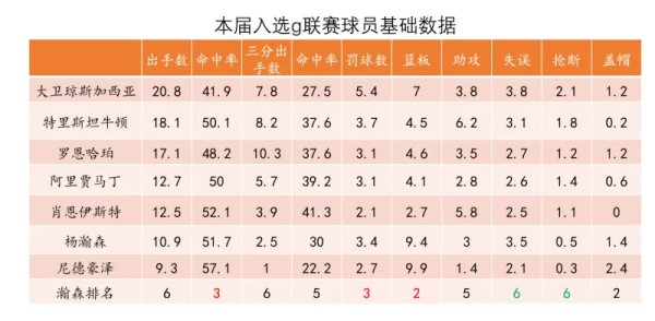 我们再进一步看看这次入选的7名球员的整体基础数据情况,可以看到瀚森在这7名球员里的命中率能排名第3、罚球数排名第3、篮板数排名第2,盖帽数排名第2,且所有基础数据中没有排名垫底的,这至少说明了瀚森的数据表现在入选的7人里属于中间档次。