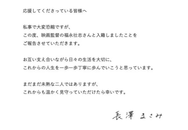 “非常抱歉以私事打扰大家。我已与电影导演福永壮志先生正式入籍。
