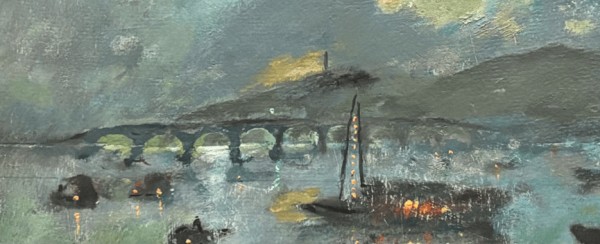 在这一版的《石湖串月》中,90岁的颜文樑运用大量的油彩,让浮云与夜幕挣脱形体束缚。月色朦胧中,水天相接处全是流动的情绪。他将粉绿、草绿、深绿糅合以表现浮云,用普兰、群青、钴兰、湖兰、青莲等颜色,以点块状的笔触渲染夜幕。画面中的渔船上还泛着的点点红光,远处的行春桥清晰可辨。颜文樑用色彩张力,把对故乡和艺术的热爱藏进每一笔。