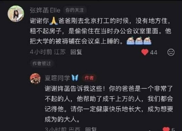 女儿在哀思中写道:爸爸刚去北京打工的时候,租不起房子,偷偷睡在会议室里,用的还是大学时的被褥。爸爸总说等女儿考上大学,一定要亲自帮她填志愿,她却没等到那一天。父女伴的时光,竟只有短短十年。