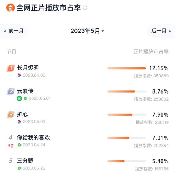 其次是热度方面,没有超越《长月烬明》的作品出现。据灯塔专业版显示,5月剧集热度TOP10里,《长月烬明》仍排在第一,且是唯一一部正片播放市占率过两位数的。