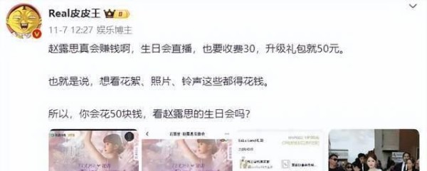 赵露思生日会:线上收费,线下免费,这是丑陋,还是矛盾?超人气女演员赵露思庆祝24岁生日,收到了奢侈品牌的代言人身份,也举办了一场生日会。然而,一些大V却开始挑剔,质疑赵露思从粉丝身上赚钱。因为从曝光的活动界面可以明显看出,会议礼包需要30元才能观看直播,相当于在网上买了一张票,如果粉丝想要享受高配版的福利,就得花更多的钱。