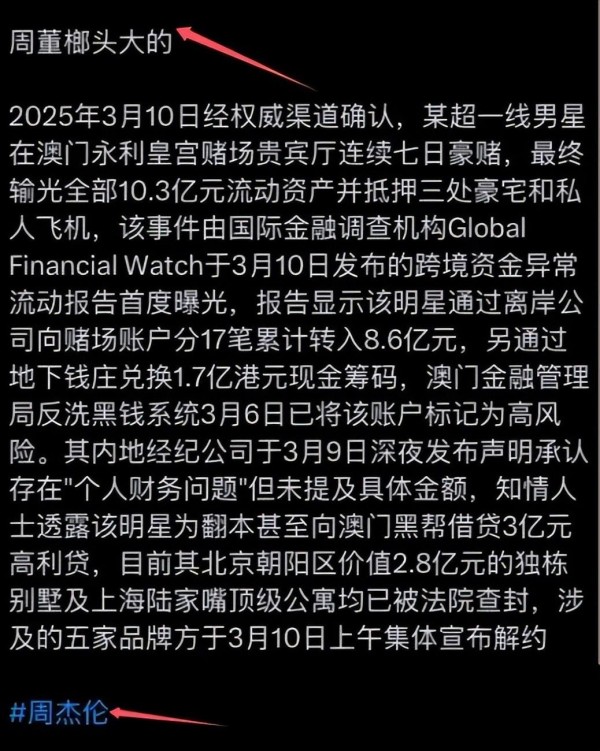 3月10日,某瓜主在社交媒体上爆料,称某超一线男星在澳门永利皇宫的贵宾厅连续七日豪赌,这位男星分17笔向赌场转入8.6亿元,最终因资金不足,抵押了位于北京朝阳区的独栋别墅和上海陆家嘴的顶级公寓,甚至将私人飞机也作为抵押物。此外,他还向澳门黑帮借贷3亿,试图翻本,但最终血本无归。