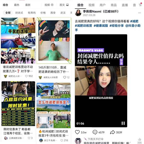 图/小红书上减肥训练营内容(左),抖音博主减肥营吐槽视频(右);来源/燃财经截图