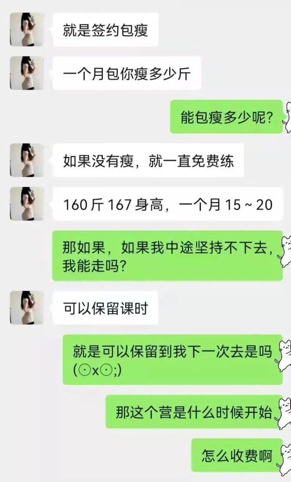 当燃财经询问“我现在150斤,想减重到120斤,一个月可以吗?”时,该销售顾问避重就轻地回答:“减重30斤的话,1-3个月都有可能,建议先报一个月的课程试试看。”当感觉到燃财经对减肥时间和减肥斤数有所犹豫后,该销售则迅速转变了话风,“签约包痩,一个月15-20斤”,并承诺“如果没有瘦,就一直免费练。”