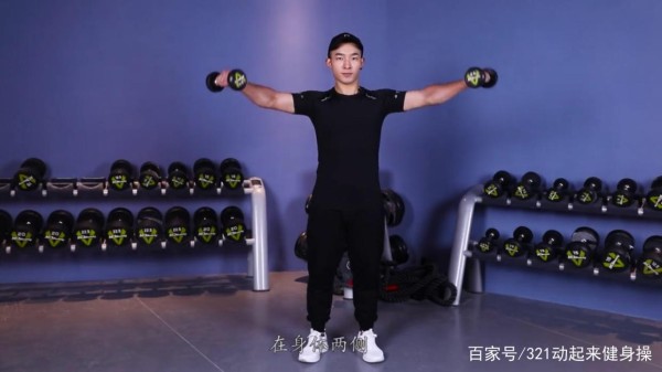 手臂拿起哑铃在身体两侧,肩胛骨收紧肩带下沉,避免上斜方肌发力,吸气准备,呼气发力,将手臂向两边抬起至肘关节略超过肩关节,吸气缓慢还原,一组12到15个,做5组。