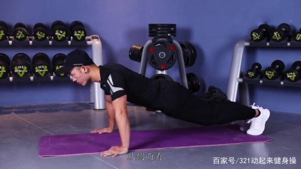 双手五指并拢,指尖朝向正前方,两手间距中握距,全手掌接触瑜伽垫,挺胸收腹,下颌微收,双眼目视前方,手腕与骨盆保持中立位,从侧面看,耳、肩、髋在同一条直线上,脊柱保持正常的生理性曲度,向上至肘关节伸直,但不可过伸。胸大肌充分收缩,向下至肩关节与肘关节平齐,或略低于肘关节,保持胸大肌的持续张力。一组12到15个,做5组。
