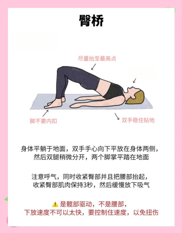 平躺屈膝,双脚平放地面,臀部发力将骨盆抬离地面至肩、髋、膝呈直线,顶峰收缩1-2秒后缓慢下落。这个动作能改善臀肌无力,矫正骨盆前倾,是塑造翘臀的基础动作。进阶可采用单腿臀桥,每侧15次×3组。