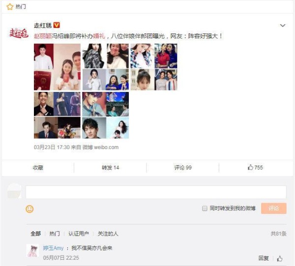 婚礼对于每一个女孩子来说,都是一生中最美好特别的日子,希望赵丽颖冯绍峰夫妇能一直幸福美好下去!得知消息,私底下一大群明星发祝福送祝福,通过这次机会,也见识到了冯绍峰赵丽颖夫妻的人缘还是非常不错的!