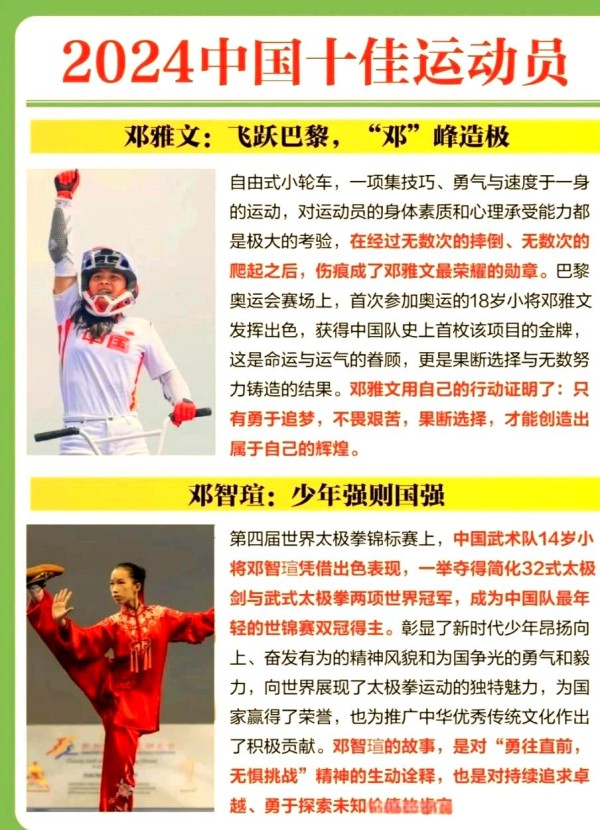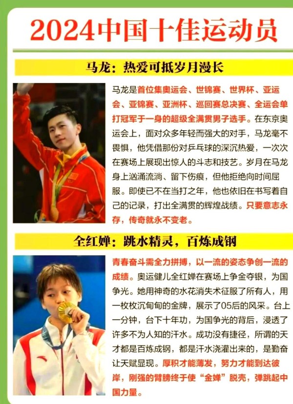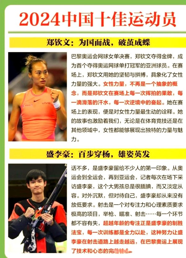 你曾设想过中国体育的巅峰风采吗?这十位杰出的运动员,便是最好的答案。他们各自诠释着冠军的非凡魅力,以卓越的成绩和出色的表现,成为中国体育的璀璨名片。