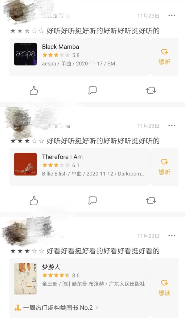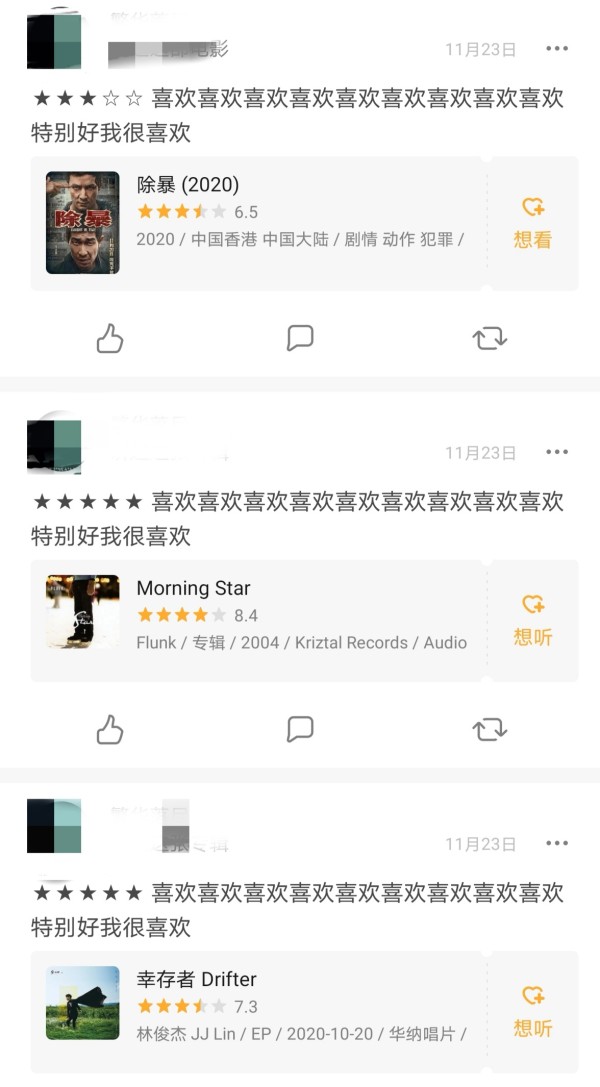 解放日报·上观新闻记者检索相关页面发现,不仅上述编辑所提的新书《记忆记忆》是重灾区,如四大名著或非常小众的老电影等,其短评区都有“养号”痕迹。不少粉丝账户颇不走心:在任何作品下的评价,全都如出一辙。有的是无数个“好看”或“好听”,有的是无数个“喜欢”,有的则复制了他人的评价,显得颇为突兀。