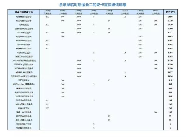 在骗票事件中,余承恩后援会欠奶卡共27492张,按照黄牛2-3元一张奶卡的价格来算,折合人民币共计7万元左右。每张奶卡可为11个选手没人投票4次,即所欠票数累积超过120万张,后援会承诺会为进入第三阶段的选手补票,离开的选手则按照一卡5元计价赔偿金额。