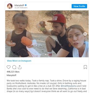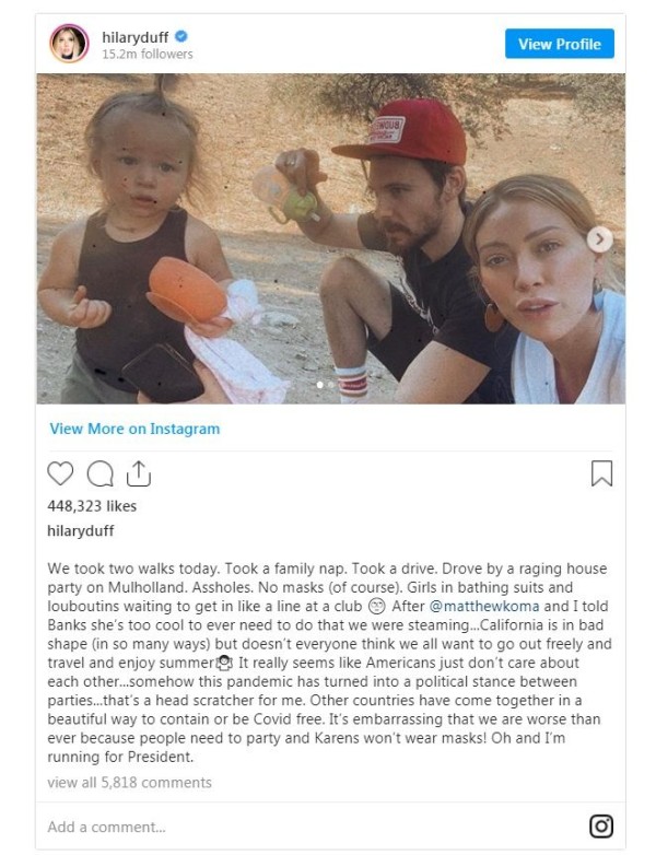 7月5日,曾经主演《平民天后》的美国女演员、歌手希拉里·达芙(Hilary Duff)在Instagram上分享了自己对新冠肺炎大流行如何影响美国的看法,批评疫情成为了政党表达政治立场的工具。