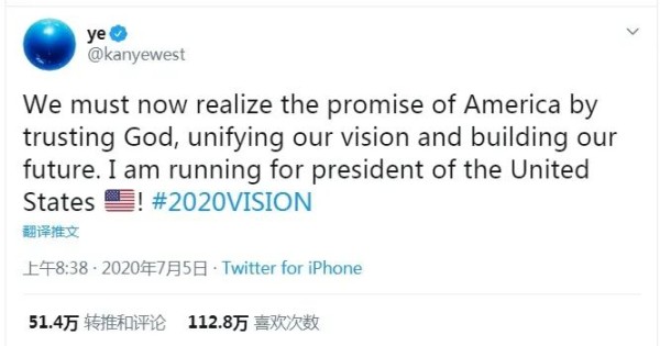 继美国嘻哈歌手“侃爷”坎耶·韦斯特(Kanye West)7月4日在推特上宣布竞选美国总统后,美国社交网站上掀起了“竞选总统热”,多位明星纷纷宣布参选。