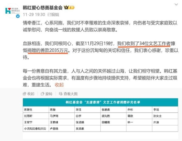 为香港火灾低调捐款8900万!超130位艺人参与,真善意无需热搜
