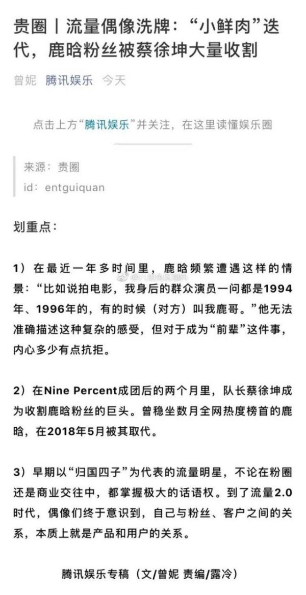 今天上微博,看到有人发表了一遍《流量偶像2.0时代》,大概讲鹿晗糊了,黄牛党表示鹿晗门票卖不动,粉丝也不会大规模追星,大概讲述了一下鹿晗最高人气时现象级盛况,引出了18年《偶像练习生》中新生代偶像出现,对‘归国四子’造成了重大影响之类的,鹿晗的粉丝大量被蔡徐坤接收,讲真的,你们低估了鹿晗的粉丝管理团队有多么强大,鹿晗的粉丝不仅存在于韩粉中,而且也大量存在于中小学学生,如果说啥时候鹿晗不火了,大概要到5-6年之后,等到鹿晗最忠实的一批粉丝考入大学,新一批偶像收获大量新一批中小学生。