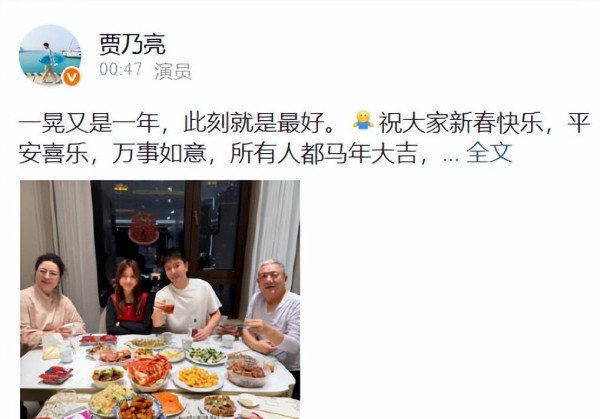 除夕夜,贾乃亮在社交平台晒出了一张全家福。照片里,他和父母、女儿甜馨围坐在餐桌前,四个人举杯对着镜头,笑容满面
