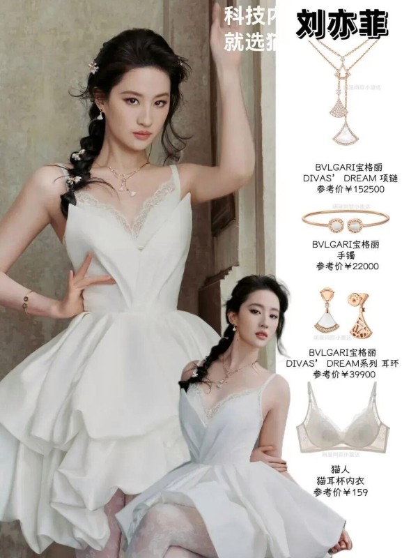 刘亦菲拍猫人广告那天,脖子上挂着宝格丽Serpenti项链,手上戴着宝格丽手镯,耳朵上挂着宝格丽耳环。一身行头20多万,给159元的内衣当配饰。