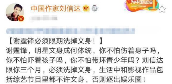 原来,刘信达喊话先后喊话张艺兴、谢霆锋、袁姗姗,痛批他们纹身会害了青少年,限期洗掉,否则将被逐出娱乐圈。