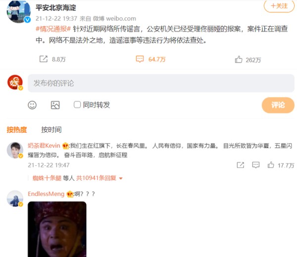 序言:很多明星被造谣之后,本人或者工作室会在微博表示已经报警了,而且还晒出回执单,证明是真的报警了,不是吓唬网友。2021年12月22日,佟丽娅本人和工作室没有发微博表示报警了,但是“平安北京海淀”通报了此事。
