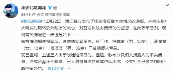 这是有史以来第一次,警方主动通报有明星被造谣,受理了明星的报案。本以为这件事没有下文了,没想到12月29日,“平安北京海淀”再次通报此事:警方接到相关报案后,遂依法受案调查。经工作,将魏某(男,35岁)、周某某(女,43岁)、唐某某(男,36岁)三名嫌疑人查获。