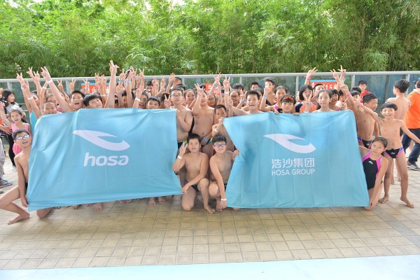 身着浩沙提供的专业泳装的小学员们在游泳助教带领下进行学习