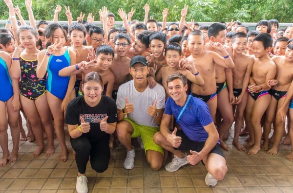 叶诗文、孙杨、汤姆·戴利和三亚的小学生合影