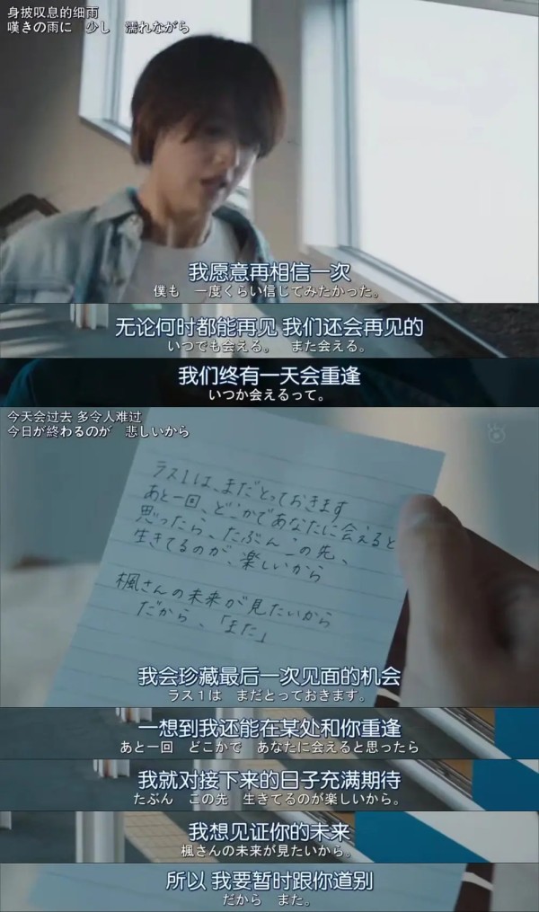 而征史郎最终还是遵从了”数字“的安排,在两人还剩最后一面的时候选择离开,决定把最后一面保留到未来。最终枫在下楼梯的时候也停住,看着征史郎走上列车远去,她这时候应该也被征史郎说服了,对未来保持期待,相信某一天会再次遇见。