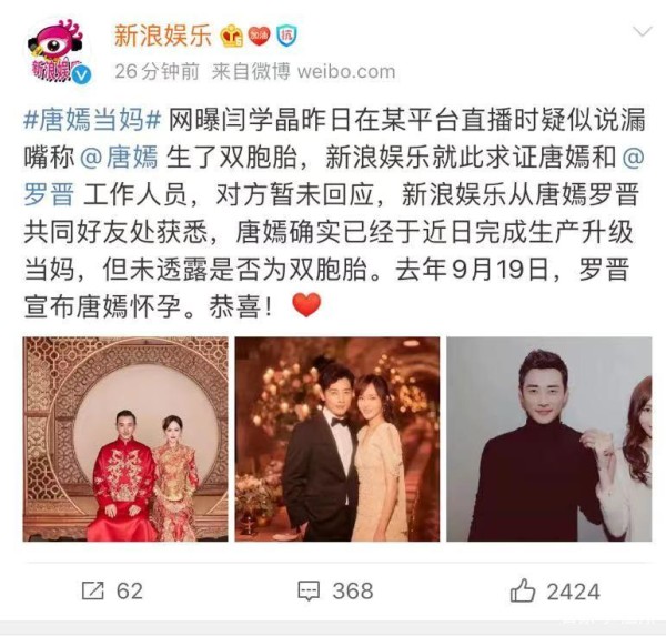 闫学晶没说错,罗晋唐嫣共同好友称已经生了,但没透露是龙凤胎