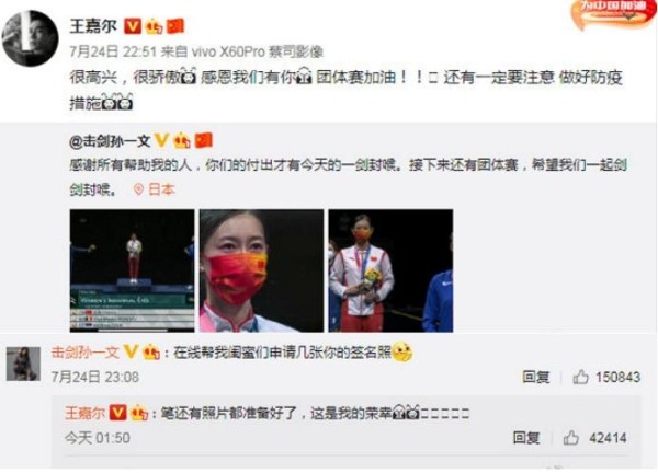 2020年东京奥运会,重剑击剑运动员孙一文勇夺冠军后,王嘉尔第一时间送上祝福,感恩他们的努力为国家带来荣誉。而当孙一文向他为闺蜜索要签名照时,他谦虚的回答“笔还有照片都准备好了,这是我的荣幸!”其对体育爱好可见一斑。