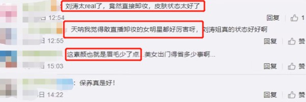 网友们也都被刘涛当众直播卸妆的举动惊讶到,表示素颜皮肤状态太完美,也就是眉毛少了一点。也有网友表示敢在镜头前卸妆的女明星不多,刘涛可谓是真实且勇敢。