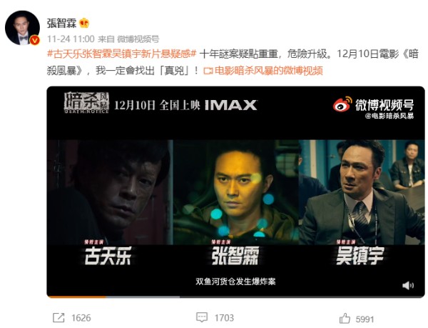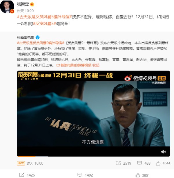 背靠大树好乘凉,张智霖签了古天乐的公司,所以他有很多戏可以拍。12月10日,古天乐、张智霖、吴镇宇主演的电影《暗杀风暴》要上映;12月31日,古天乐、张智霖、郑嘉颖主演的《反贪风暴5》要上映了。