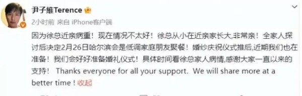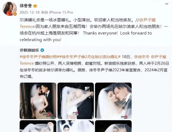 本来徐冬冬和尹子维的婚礼定在2026年2月26日,就因为谐音“爱了爱了”,时间选得浪漫又有趣。不过距离婚礼还有四个月,徐冬冬却通过尹子维的微博宣布,婚礼大改计划:因她的大伯病重,婚约不得不延期。盛大仪式没了,改成家庭聚餐,还公开表态“不收礼金”,让网友一边心疼她的大伯病情,一边佩服这对夫妻拒绝人情负担的态度。