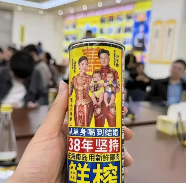 但别以为这土味就简单了事,这波椰树定制包装绝对用心到极致。罐子正中央印着徐冬冬和尹子维的结婚照,尹子维搂着徐冬冬,旁边还配俩叼着奶瓶的娃娃,直白得超乎寻常——这不就是明晃晃催生的“早生贵子”?土味里溢出了一股亲和力,把婚礼祝福印到了瓶身细节。而且包装还融入了徐冬冬代言椰树以来的经典口号,全新升级版“从单身喝到结婚”,直接把她的婚姻故事和产品品牌强绑定,既喜庆又扎眼,真的谁看了都不会忘。
