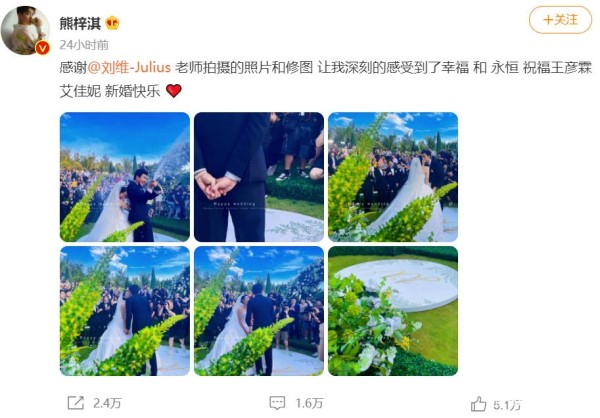 熊梓淇发布微博:“感谢刘维老师拍摄的照片和修图,让我深刻地感受到了幸福和永恒,祝福王彦霖和艾佳妮新婚快乐。”
