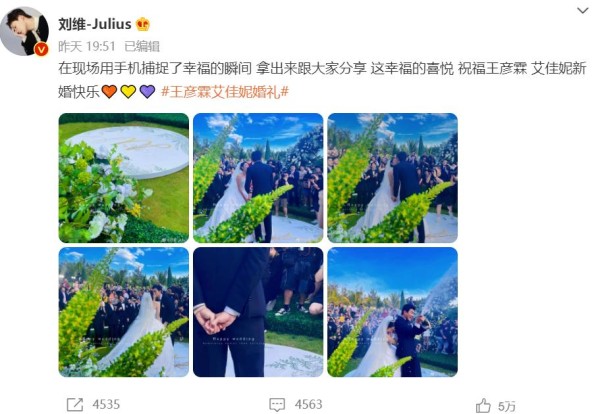刘维发布微博:“在现场用手机捕捉了幸福的瞬间,拿出来跟大家分享,这幸福的喜悦,祝福王彦霖和艾佳妮新婚快乐。”原来,刘维也在婚礼现场。