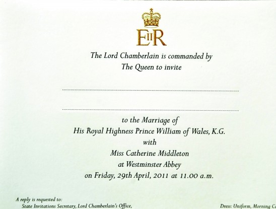 邀请函写道,女王邀请“(受邀者)于2011年4月29日11时前往威斯敏斯特教堂出席威廉王子殿下和凯特·米德尔顿小姐婚礼”。