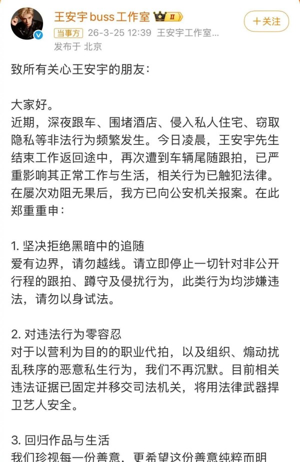 聊到这件事的时候,很多人第一反应都是这太过分了吧?可现实是,这样的“私生饭”行为,早就不是第一次发生。王安宇工作室这次公开声明、直接报警,也算是真正忍无可忍了。过去他们已经多次劝阻,但对方不但没收敛,反而越来越猖狂,从偷拍到尾随,再到私自闯入私人住宅,这已经不是“狂热”那么简单,而是彻底触碰了法律的红线。