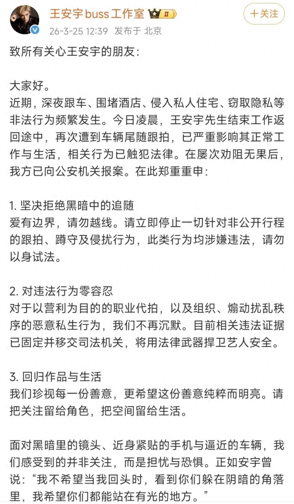 2026年3月25日,王安宇工作室的一则报警声明,瞬间击穿了饭圈的虚假温情面纱。