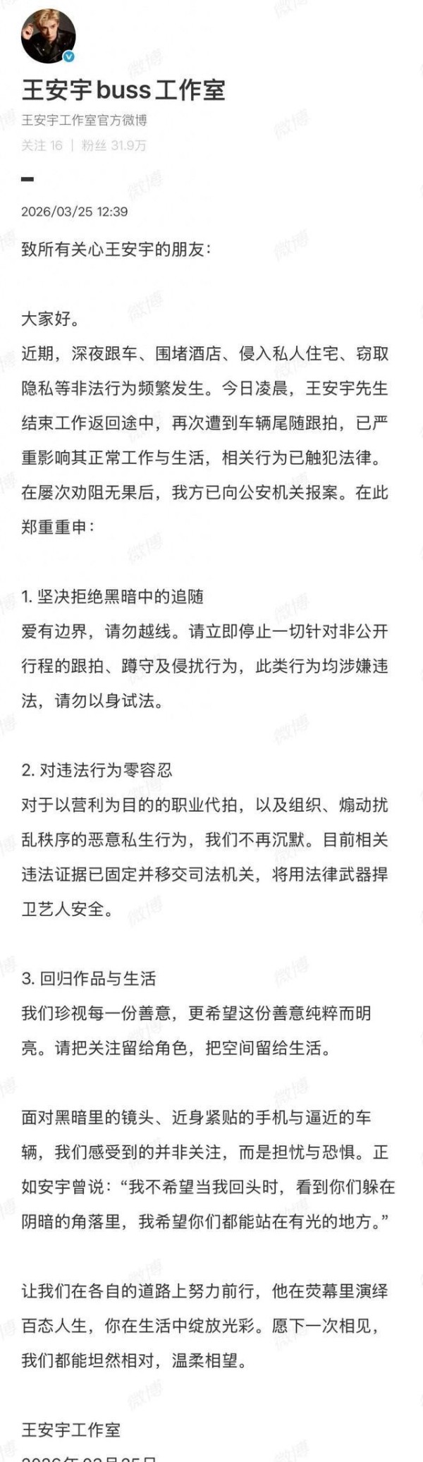"今日凌晨,王安宇先生结束工作返回途中,再次遭到车辆尾随跟拍。"