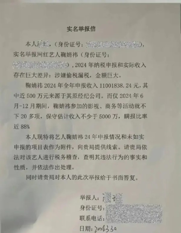 在社交媒体平台上,三张实名举报鞠婧祎税收违法行为的函件流传,反映鞠婧祎存在收入申报不实、涉嫌偷税漏税等情形,引发广泛关注。