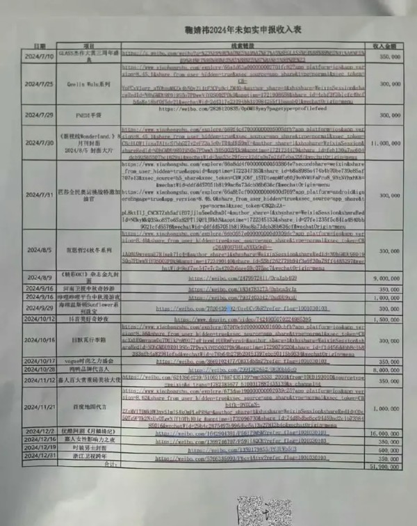 在#鞠婧祎收入明细#热搜词条下,流传的一张举报材料显示,鞠婧祎在2024年6月至12月这半年间的商业出场费及各项收入里,主演电视剧《月鳞绮纪》的片酬达1600万元;杂志拍摄方面,《新视线Wonderland》和《精彩OK》分别入账1100万元和900万元。