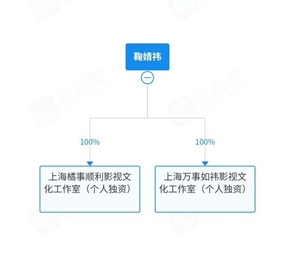企查查APP显示,鞠婧祎名下关联两家企业,分别为上海橘事顺利影视文化工作室(个人独资)、上海万事如祎影视文化工作室(个人独资),两家企业均由鞠婧祎全资持股并担任投资人。