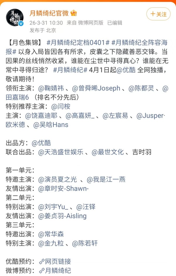 正值其偷税漏税实名举报风波引爆舆论的敏感节点,《月鳞绮纪》于3月31日突然官宣定档,将于4月1日正式开播。