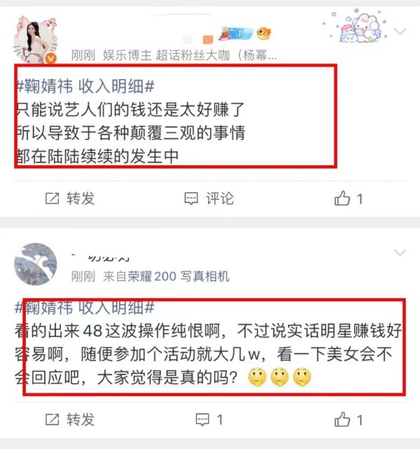 粉丝指出,鞠婧祎在丝芭时期分成比例只有10%到20%,收入是否合理也让人怀疑。