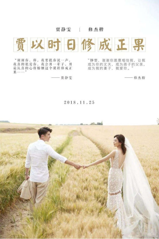 上个月25号,也就是11月25号他们在巴厘岛补办了他们的婚礼,婚礼上面的伴手礼语句更加甜到爆‘贾以时日 修成正果’用了他们的姓。
