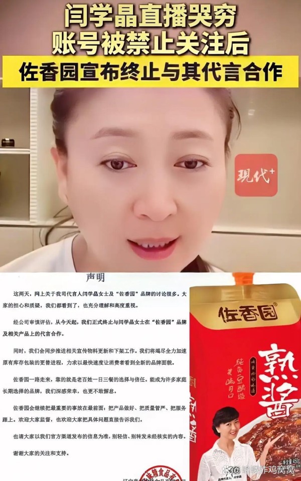 闫学晶翻身无望了,账号被禁都还只是毛毛雨,就在刚刚,佐香园发布声明:正式终止与闫学晶女士在“佐香园”品牌及相关产品上的代言合作。这一纸声明,像一记重拳,直接砸在闫学晶风雨飘摇的商业版图上。作为调味品界巨头,佐香园的解约不仅撕裂了她的代言阵营,更标志着品牌对其的信任彻底崩塌。这次风波,是深陷流言卷中的危机升级,还是一场自我膨胀后遗症?背后的故事很值得深挖。