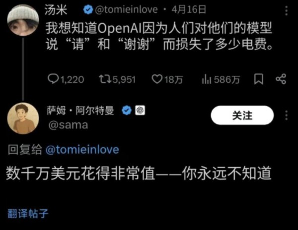 OpenAI CEO奥特曼曾透露,仅仅因为用户多说了一个“谢谢”,ChatGPT的成本就要增加数千万美元。