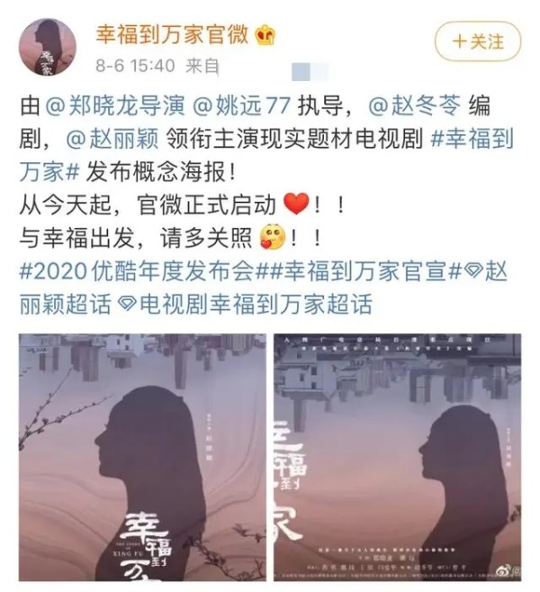 8月6日,电视剧《幸福到万家》官方社交平台发布了概念海报,并官宣这部由郑晓龙执导的剧集邀请到了赵丽颖担任女主角,赵丽颖随后也发博呼应。